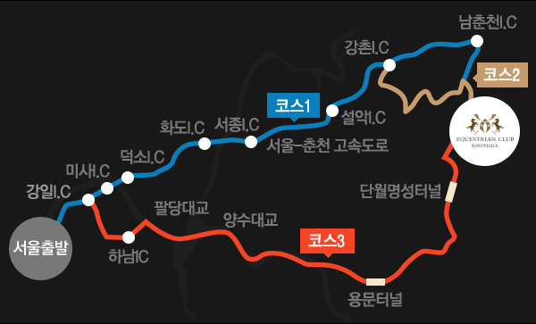 서울 ▶ 강일 IC ▶ 미사 IC ▶ 덕소 IC ▶ 화도 IC ▶ 서종 IC ▶ 서울.춘천간 고속도로 ▶ 설악 IC ▶ 강촌 IC ▶ 남춘천 IC ▶ 소노펠리체 승마클럽